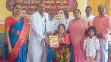 ಬಾಲ್ಯ ಭರತ ನಾಟ್ಯ ಕಲಾವಿದೆಗೆ ಸನ್ಮಾನ ಗದಗ:ಸತ್ಯಮಿಥ್ಯ(ಸೆ-12). ನಗರದ ವೀರೇಶ್ವರ ಪುಣ್ಯಾಶ್ರಮದಲ್ಲಿ ಗದಗ ಜಿಲ್ಲಾ ಸಂಸ್ಕೃತ ಪಾಠಶಾಲಾ ಶಿಕ್ಷಕರ ಸಂಘದ ಸಂಯುಕ್ತ ಆಶ್ರಯದಲ್ಲಿ ಜರುಗಿದ ಯುಷ್ಮಾಕಂ…