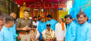 30ನರೇಗಲ್‌4: ನರೇಗಲ್‌ ಪಟ್ಟಣದ 3ನೇ ವಾರ್ಡ್‌ನ ಆಶ್ರಯ ಕಾಲೋನಿಯಲ್ಲಿ ಹಿಂದು-ಮುಸ್ಲಿಂ ಧರ್ಮಿಯರು ಸಾಂಘಿಕವಾಗಿ ಪ್ರತಿಷ್ಠಾಪಿಸುವ ʼಭಾವೈಕ್ಯ ಗಣೇಶೋತ್ಸವʼ ದಲ್ಲಿ ಪಾಲ್ಗೊಳ್ಳಲು ಆಗಮಿಸಿದ ಗದಗ ಜಿಲ್ಲಾ ಪೊಲೀಸ್ ವರಿಷ್ಠಾಧಿಕಾರಿ ರೋಹನ್‌ ಜಗದೀಶ್‌ ಅವರನ್ನು ಓಣಿಯ ಮಹಿಳೆಯರು ಆರತಿ ಮಾಡಿ ಸ್ವಾಗತಿಸಿದರು. ನರಗುಂದ ಡಿವೈಎಸ್‌ಪಿ ಪ್ರಭುಗೌಡ ಕಿರೇದಹಳ್ಳಿ, ರೋಣ ಸಿಪಿಐ ಎಸ್. ಎಸ್. ಬೀಳಗಿ, ನರೇಗಲ್‌ ಠಾಣೆಯ ಪಿಎಸ್‌ಐ ಐಶ್ವರ್ಯ ನಾಗರಾಳ ಇದ್ದರು.